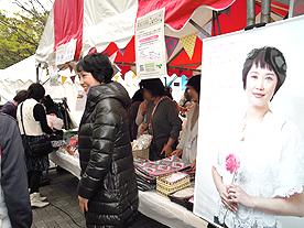 よつばの会代表原千晶、頑張っております!おかげさまでたくさんの人が足を止めてくださいました。 会員の方手作りの品々もとても興味を持って買って頂けて感激です! |